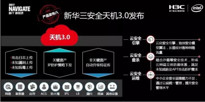 據了解,華三天機3.0具備了云安全引擎、云安全查殺、云安全運維等功能,能夠構建創新性的動態安全能力中心,并能夠提供整體安全態勢監控、安全業務快速部署、云安全防御、云端運維等一體化的安全交付能力。
