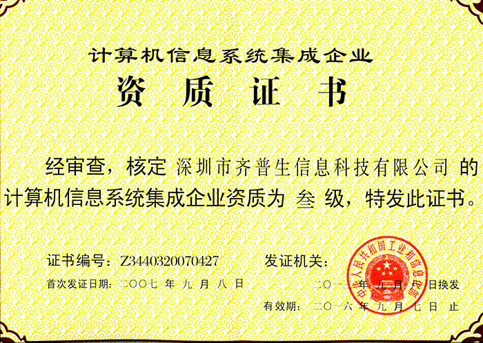 • 計算機信息系統(tǒng)集成企業(yè)資質(zhì)證書(三級)